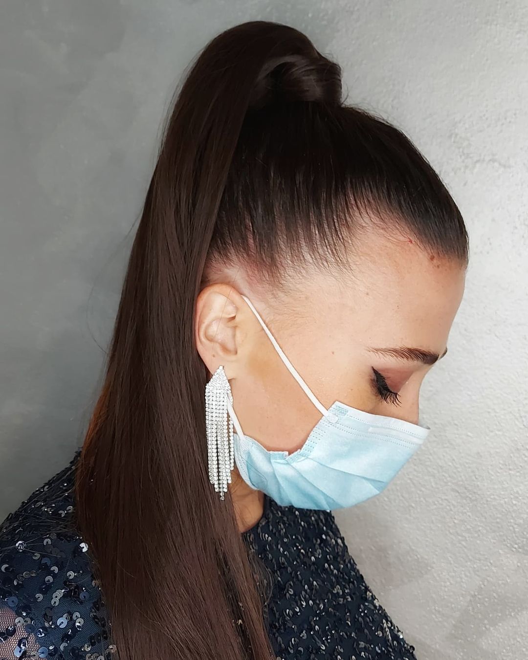 In foto, abbiamo l’esempio di un’acconciatura con coda di cavallo in versione elegante. La coda, anche chiamata con il termine in inglese ponytail, è stata realizzata su dei capelli molto lunghi. E’ una coda alta, stretta e molto tirata. La particolarità del codino ricoperto dagli stessi capelli rende questo look perfetto per occasioni speciali. Il consiglio è quello di realizzare un make up carico e strong.