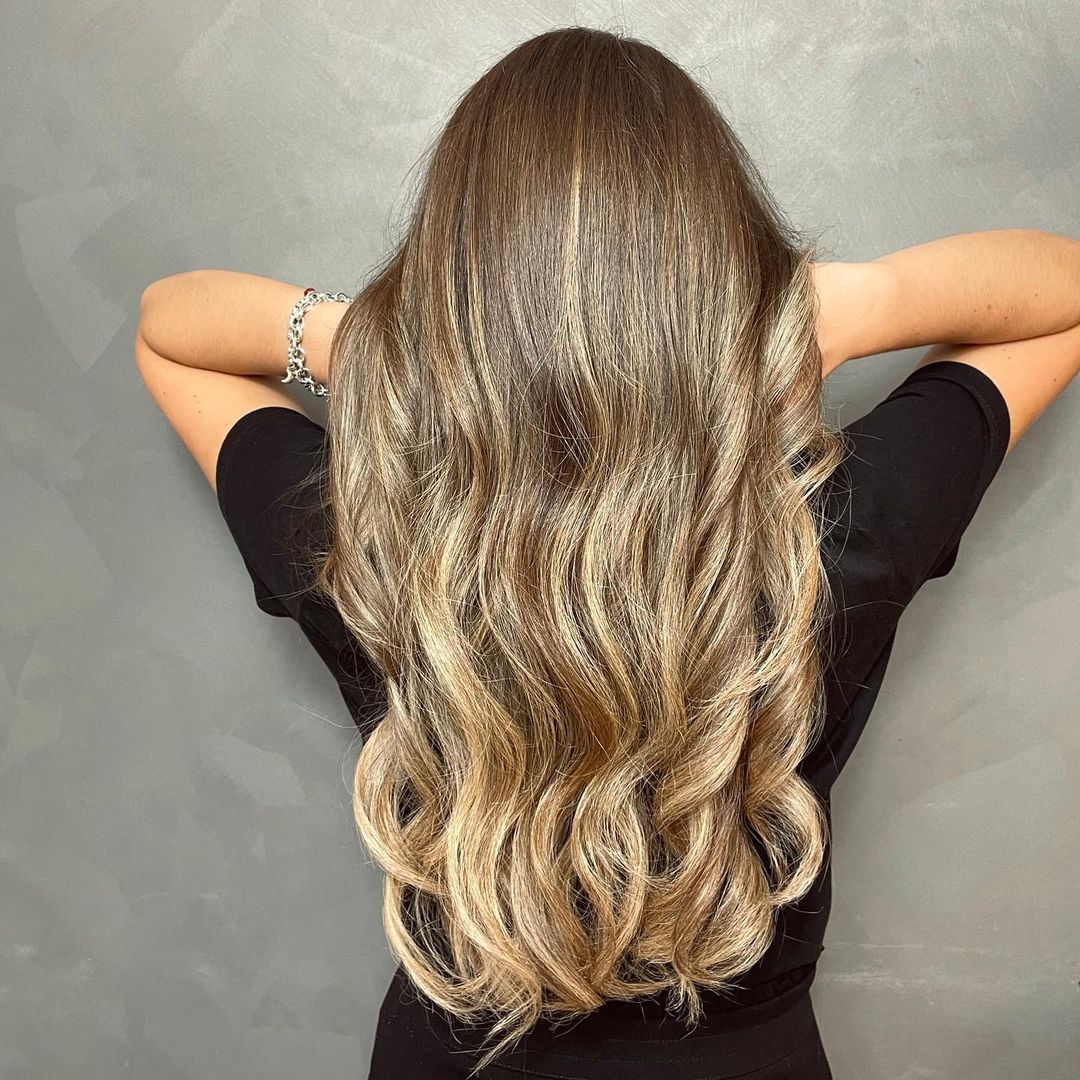 In foto, abbiamo dei capelli lunghi con sfumature bionde. L’eleganza è bellezza e questo biondo dai toni freddi non ci lascia dubbi. In questo caso la base è chiara con sfumature personalizzate tra il color biondo cenere e miele. Chiude il look una piega mossa morbida e naturale.