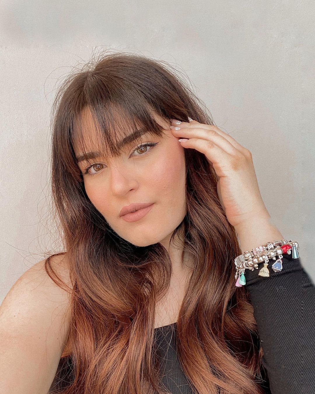 In foto, abbiamo una bellissima frangia sfilata, sottile e aperta. Viene chiamata così per la sua forma che come posiamo vedere si apre sulla fronte, addolcendo i lineamenti del volto. Questa tipologia di frangia è perfetta per valorizzare i visi più spigolosi. Il taglio è lungo. Chiude il look uno styling mosso.