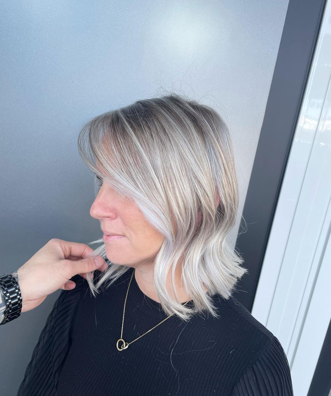 In foto, abbiamo un bellissimo esempio di questa colorazione. Notiamo un caschetto corto con riga laterale. Il taglio è di una lunghezza pari. La base è scura. Il colore bianco dal sottotono freddo, in questo caso dona una nuova luce all’intero look. Chiude una piega leggermente mossa, abbiamo un liscio spettinato meraviglioso.
