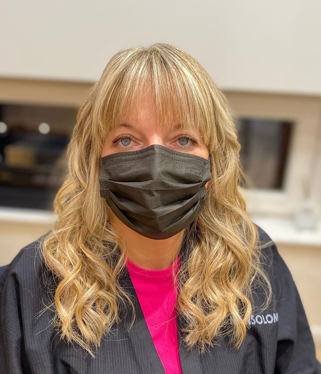 In foto, abbiamo l’esempio di un meraviglioso biondo oro su un taglio di media lunghezza. In questo caso il colore è stato realizzato partendo dalla base e quindi senza ricorrere a particolari tecniche di sfumature. La frangia sfilata valorizza questi bellissimi occhi azzurri tanto quanto fa il colore oro luminosissimo. Chiude il look uno styling mosso.