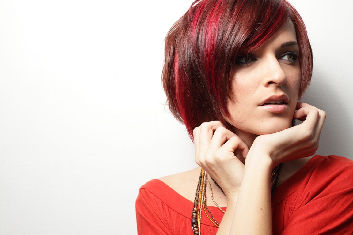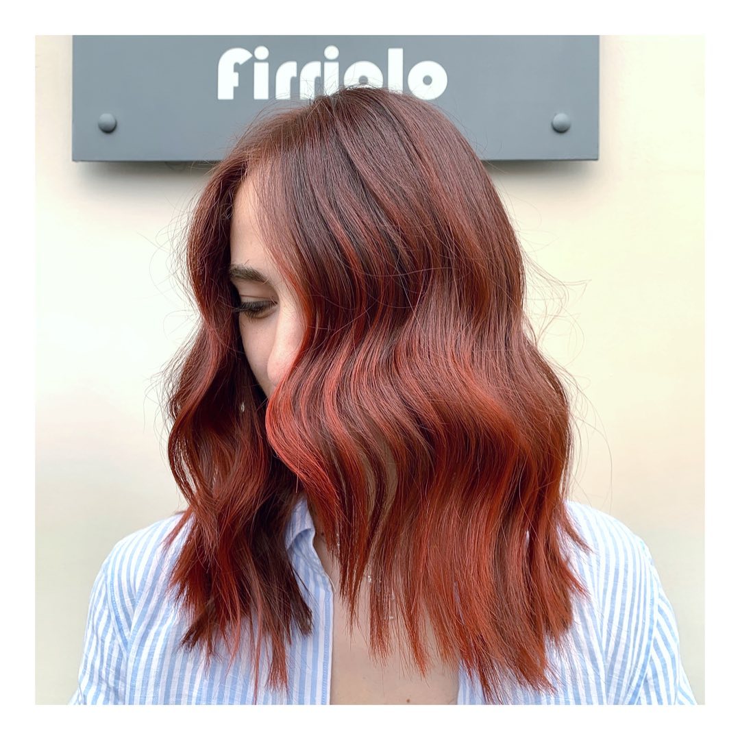 In foto, abbiamo un bellissimo look con sfumature rosse. Il taglio è di media lunghezza e leggermente scalato. La riga è stata pettinata al centro. I meravigliosi riflessi rossi sono stati realizzati su una base castana. La tecnica scelta è quella del balayage, perché l’effetto che si voleva ottenere era estremamente naturale. Chiude in bellezza il look, uno styling mosso che dona volume e mette in risalto sia la forma del taglio che il colore rosso mogano.
