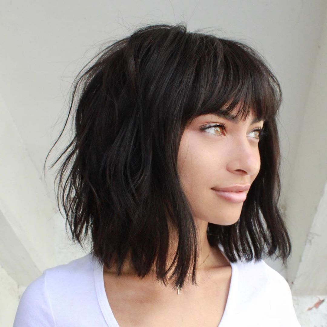 Il colore dei capelli nero è la tela perfetta per uno shag di media lunghezza. La tonalità marrone scuro aggiungerà una certa dimensione al taglio e impedirà che appaia troppo uniforme o opaca, mentre gli strati consentono movimenti imprevedibili e versatilità stilistica. A chiudere in bellezza una frangia sfilata.
