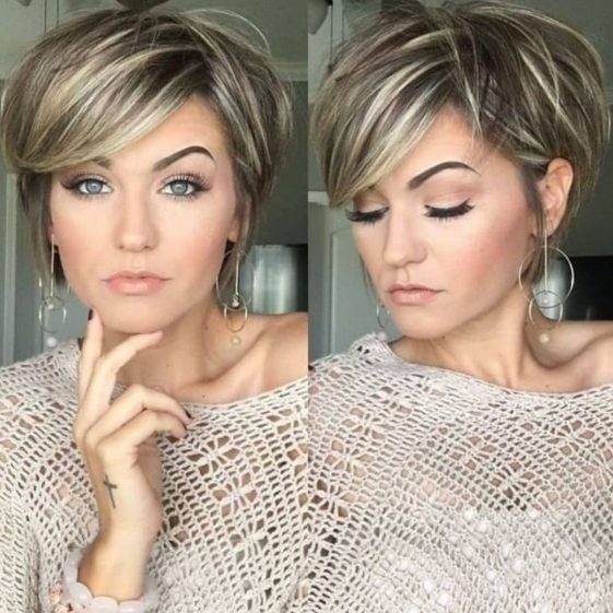 Taglio di capelli lunghezza corto. Notiamo un ciuffo sul lato e un taglio che si abbina perfettamente alla forma degli occhiali. Questa è la prova che il colore grigio sta bene a tutte le età. More