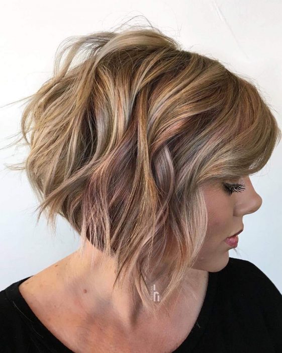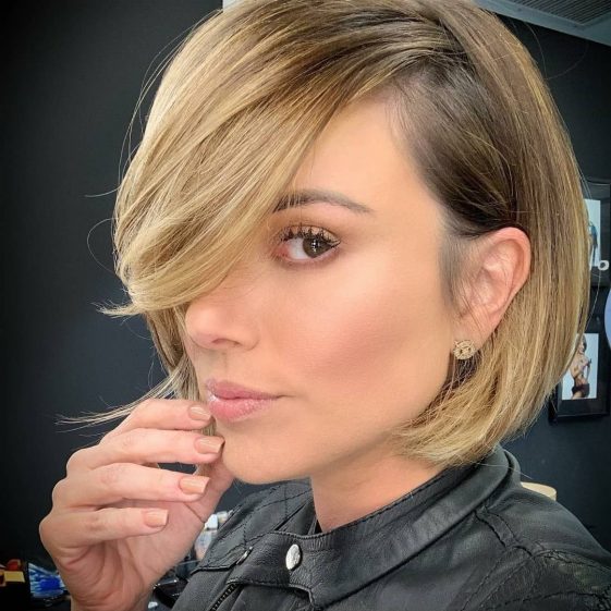 Un bob haircut bellissimo realizzato con lunghezze diverse. Dietro la nuca i capelli sono più corti. Un taglio alla moda che si adatta ad ogni tipo di forma di viso. More