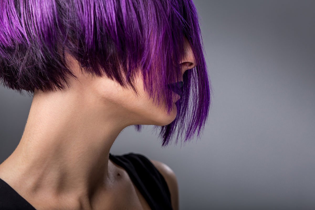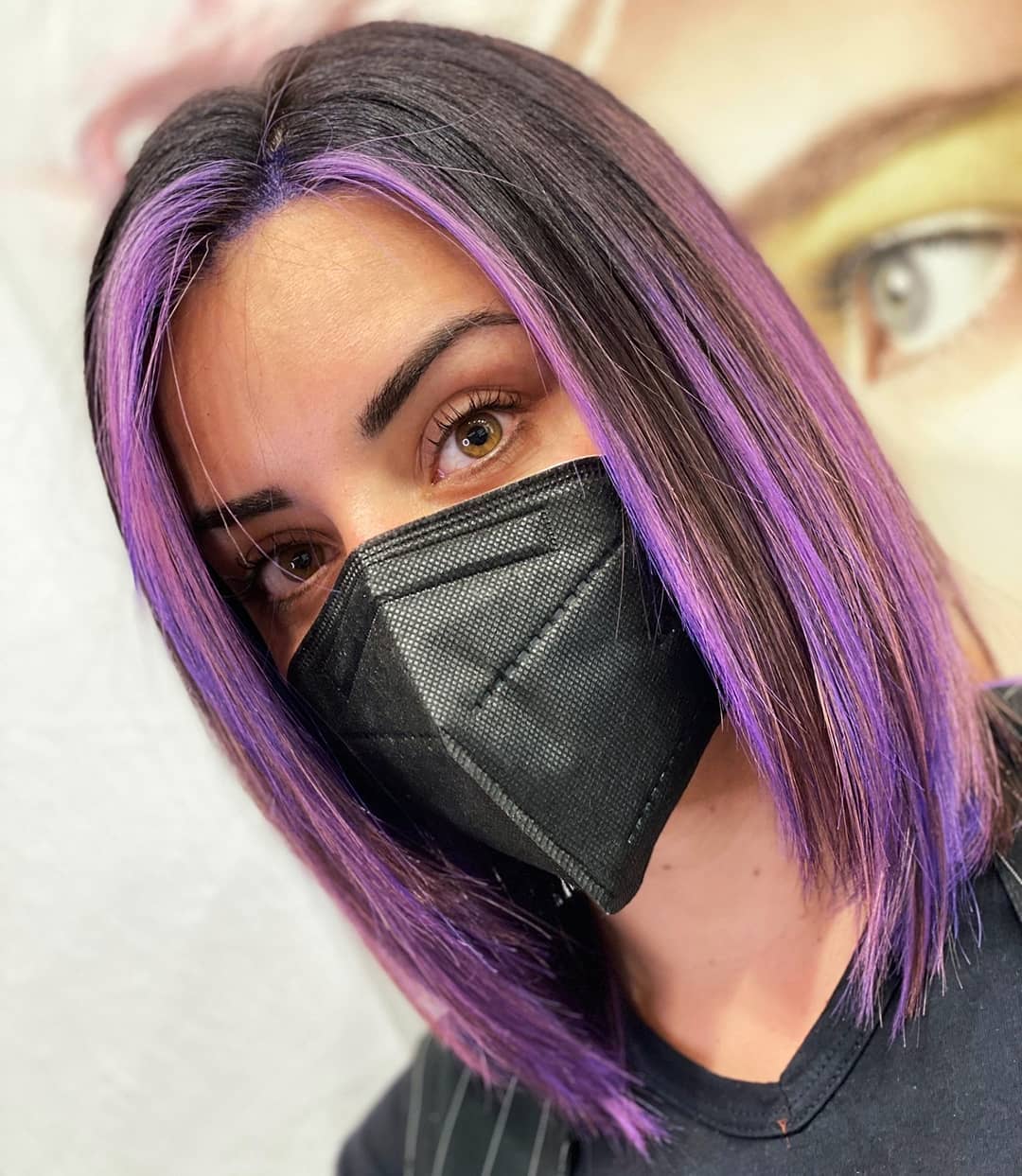 Le mèches si possono realizzare di tutti i colori. In foto, abbiamo delle meravigliose mèches viola su una base scura. In questo caso sono state realizzate quelle parziali per sfoggiare un look davvero stravagante. Il taglio è un caschetto pettinato con riga laterale. Chiude in bellezza uno styling liscio perfetto.