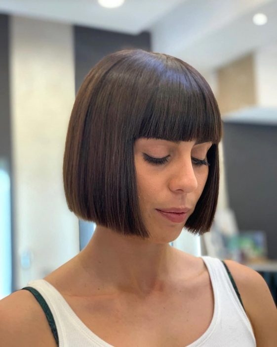 Bellissimo caschetto nero. Notiamo una lunghezza unica e super corta con una frangia dritta e folta. Un taglio che si adatta bene per chi ha un viso piccolo. More